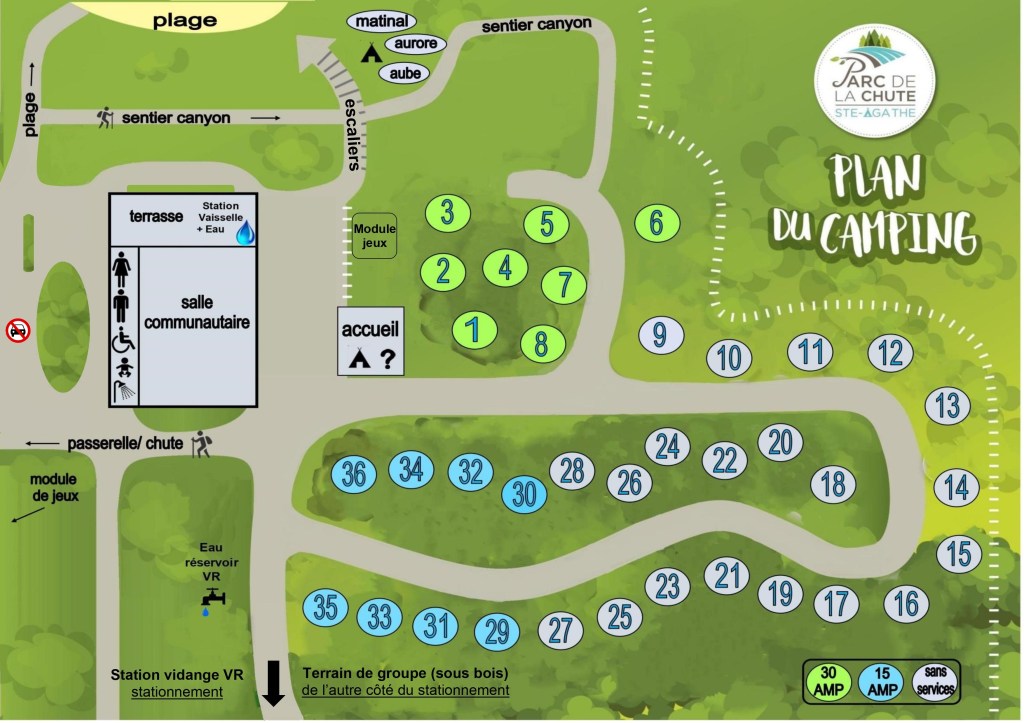 - 16 terrains avec électricité** **Concernant l’électricité : nous n’avons pas de borne électrique à chaque emplacement. Nous fonctionnons avec 2 boîtes électriques communes ou il faut ce brancher avec des rallonges. Des rallonges peuvent être prêté avec dépôt. boite électrique de 30 ampères – 8 terrains / 1 boite électrique de 15 ampères – 8 terrains